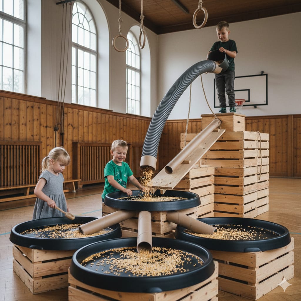 Kinetic Kids ist eine einzigartige Konstruktions-Werkstatt im XXL-Format. Statt kleiner Bausteine nutzen wir die gesamte Turnhalle als Spielfläche. Mit echten Materialien wie HT-Rohren, Industrieschläuchen und Verbindungselementen erschaffen die Kinder riesige Kugelbahnen, Tunnelwelten und Abenteuer-Parcours. Es ist die perfekte Kombination aus freiem kreativem Bauen und aktiver Bewegung.